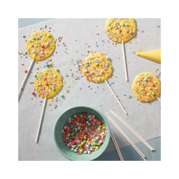 Maîtrisez le cake design à la perfection avec les Candy Melts Wilton ! Ces pistoles de Candy Melts fondent facilement au micro-ondes et n’ont pas besoin d’être tempérées… En plus, si jamais vous faites fondre un peu trop de pistoles, vous pourrez tout simplement conserver les Candy Melts fondus dans une boîte à température ambiante. Les Candy Melts sont vraiment l’ingrédient pratique par excellence pour décorer vos biscuits et réaliser des cake pops à la surface super lisse, croquante et colorée !