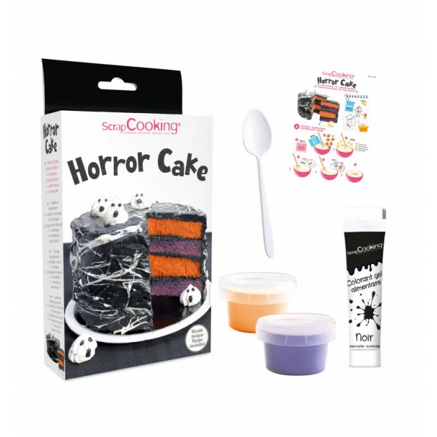 - 1 notice : avec les conseils d’utilisation des différents ingrédients et la recette Halloween de l’Horror Cake. Vous n’aurez plus qu’à suivre les indications et votre dessert Halloween sera prêt comme par magie !
