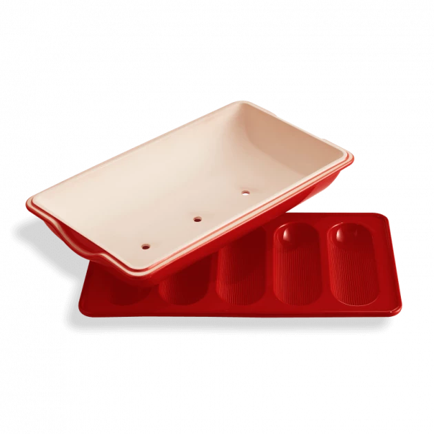 Au moment du rangement, ce moule à baguettes Emile Henry sait se faire petit pour vous permettre de gagner de la place. La base du moule en céramique s’encastre dans le couvercle pour un gain d’espace.