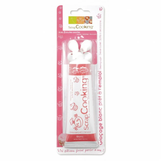 Tube de glaçage prêt à l’emploi blanc. Contient également 3 douilles assorties pour varier les décors sur vos desserts, cupcakes…